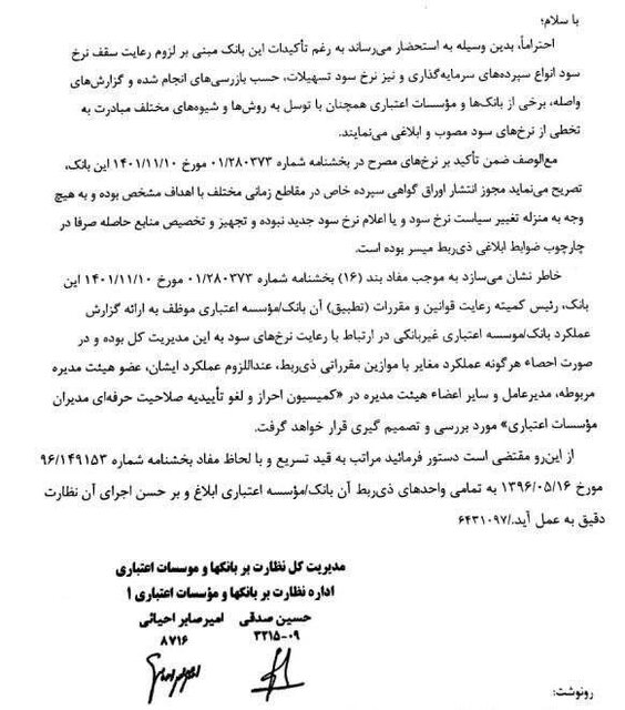احتراما، بدین وسیله به استحضار میرساند به رغم تاکیدات این بانک مبنی بر لزوم رعایت سقف نرخ سود انواع سپردههای سرمایه گذاری و نیز نرخ سود تسهیلات، حسب بازرسیهای انجام شده و گزارشهای واصله، برخی از بانکها و موسسات اعتباری همچنان با توسل به روشها و شیوههای مختلف مبادرت به تخطی از نرخهای سود مصوب و ابلاغی مینمایند.