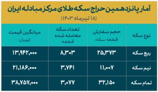 در این حراج از مجموع ۳۲ هزار و ۱۵۰ قطعه تمام سکه ثبت سفارش شده، ۳۰۷۷ قطعه با میانگین قیمت ۳۸ میلیون و ۷۵۷ هزار تومان به متقاضیان تخصیص داده شد. همچنین، از مجموع ۲۵ هزار و ۳۷۳ قطعه ربع سکه ثبت سفارش شده، ۸۳۰۳ قطعه با میانگین قیمت ۱۳ میلیون و ۹۴۲ هزار تومان به متقاضیان تخصیص داده شد. در حراج نیم سکه نیز ۱۱ هزار و ۷ قطعه سکه ثبت سفارش شد که ۳۷۴۱ قطعه با میانگین قیمت ۲۱ میلیون و ۱۸۶ هزار تومان تخصیص داده شد.